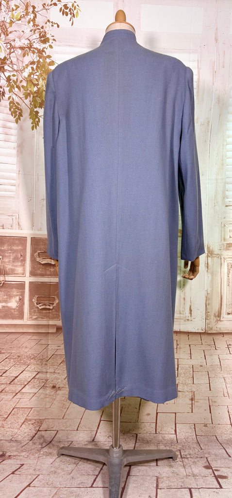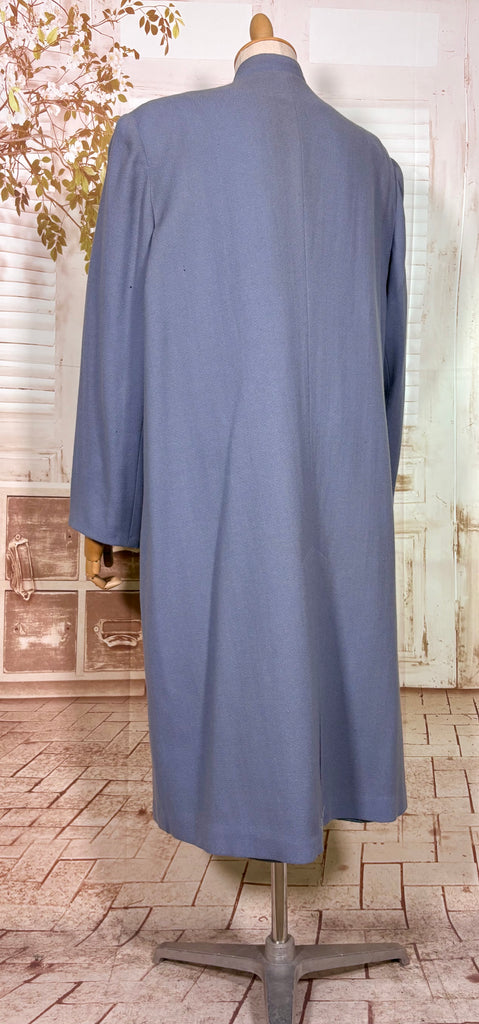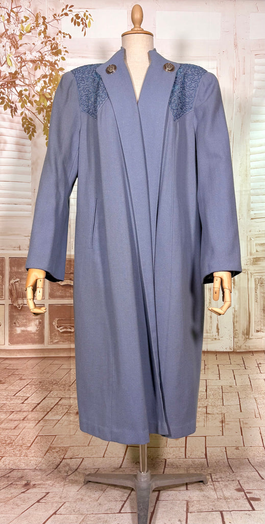 An exceptional example of late-1930s to early-1940s outerwear, this Kerrybrooke tailored clutch coat showcases the era’s sculptural design and refined attention to detail. Crafted from a soft periwinkle lilac wool, the coat features soutache embroidery at the shoulders, exquisite draping, and bold decorative metal buttons at the neckline — hallmarks of luxury pre-war tailoring. Its voluptuous cut makes it an unusually generous and rare find from this period, when fabric restrictions soon transformed silhouettes.
