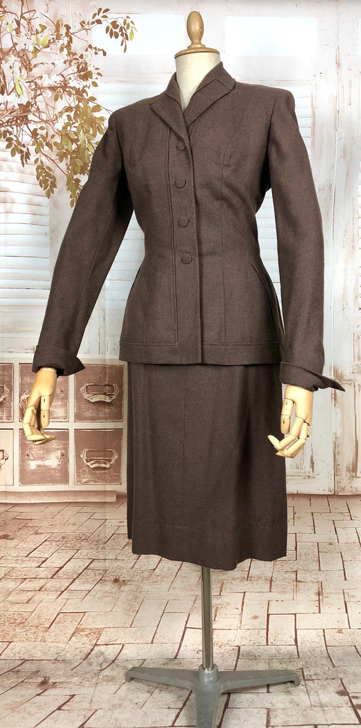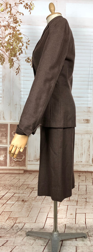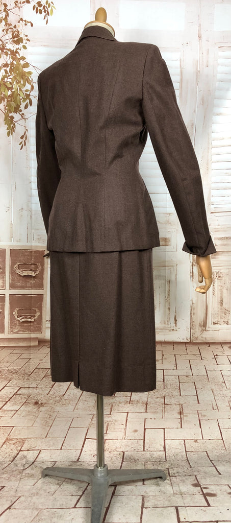 This sophisticated 1940s wartime suit embodies the streamlined tailoring of the era, crafted in a rich brown wool with sharp seam detailing that defines the waist and hips. The jacket is cut with strong shoulders, a sculpted fit, and a button-front closure that extends into a notched collar. The matching skirt is tailored in a straight, practical silhouette typical of 1940s wartime restrictions.