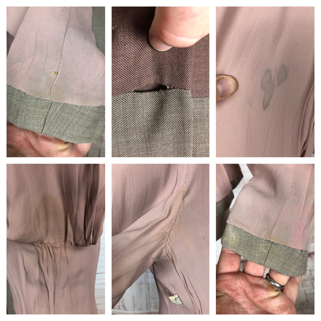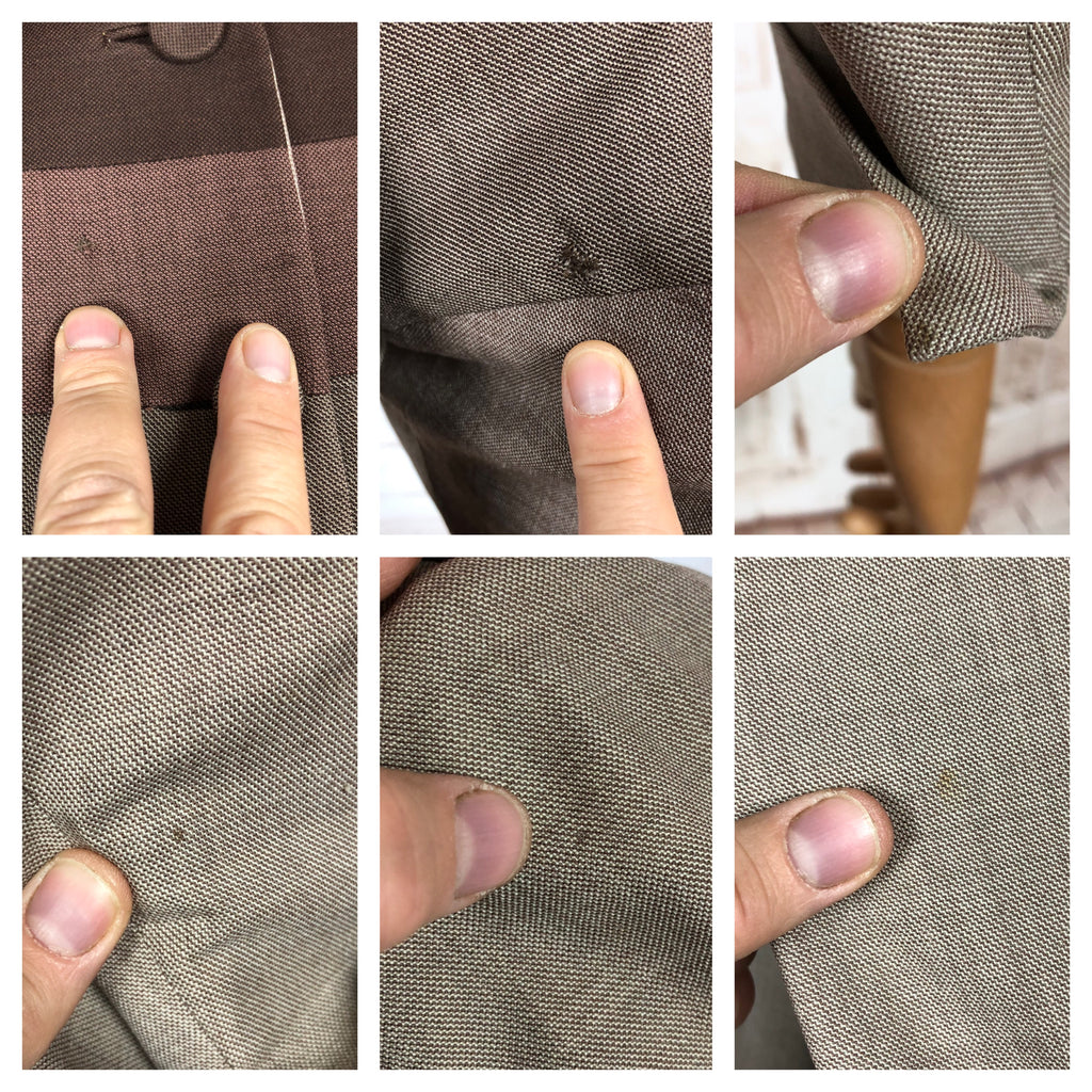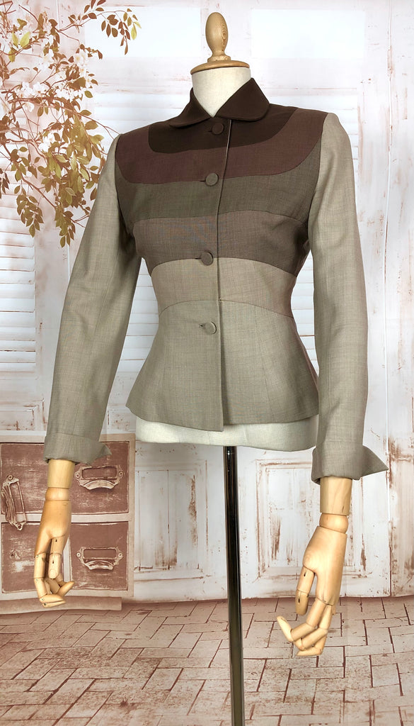 This 1950s Lilli Ann blazer showcases the label’s signature sculptural tailoring and use of imported fabrics. Constructed in a striking combination of multi-tonal striping in warm greys and browns, the jacket features a fitted waist, structured shoulders, and a short rounded collar. The bold colour-blocked effect creates a futuristic silhouettes and gives Blade Runner vibes, making it both a mid-century classic and a piece with enduring modern appeal.