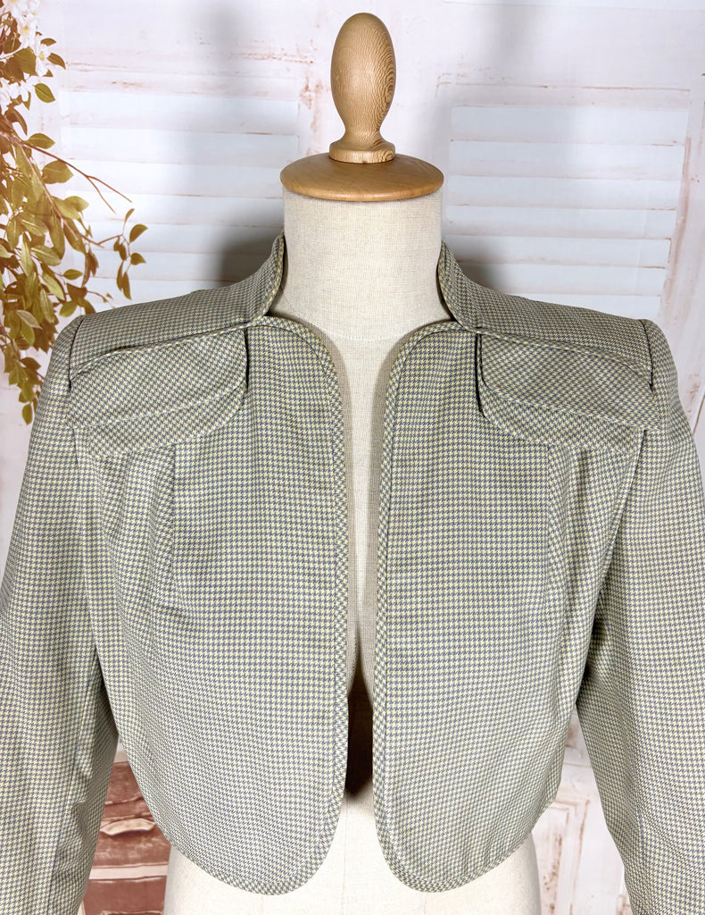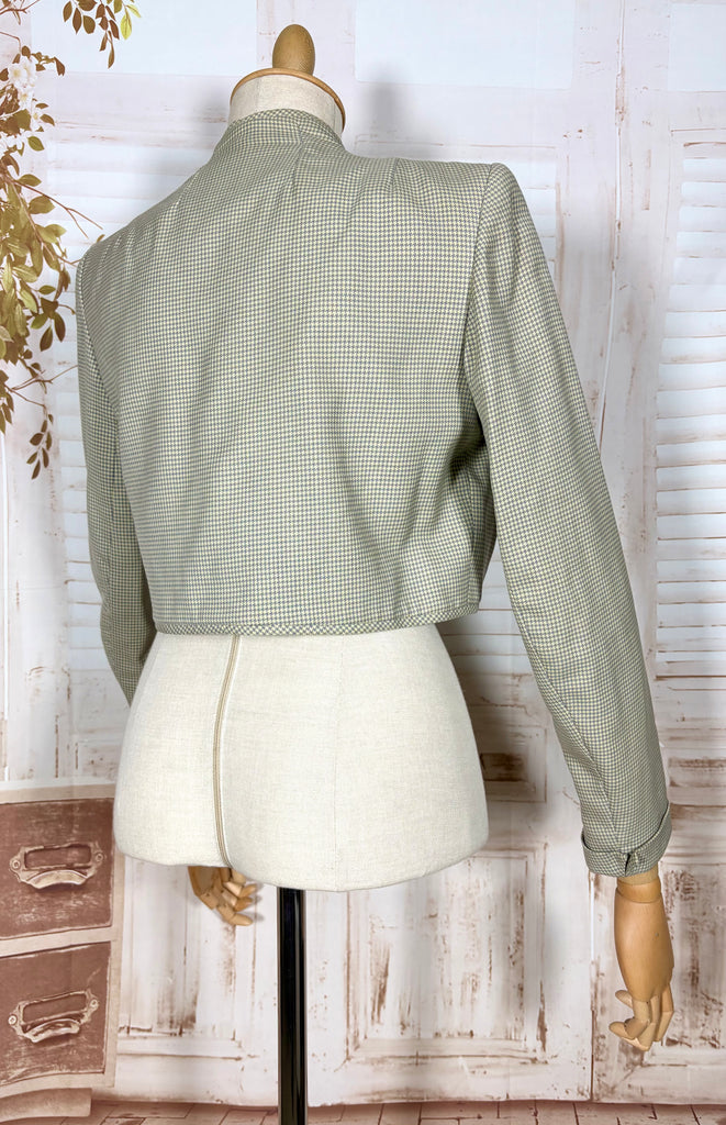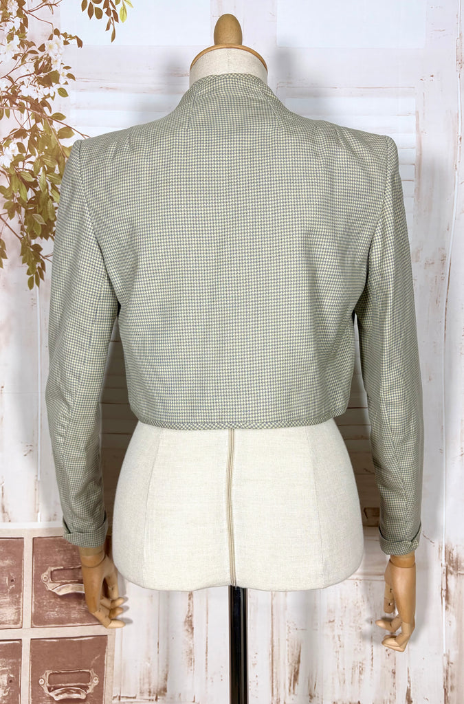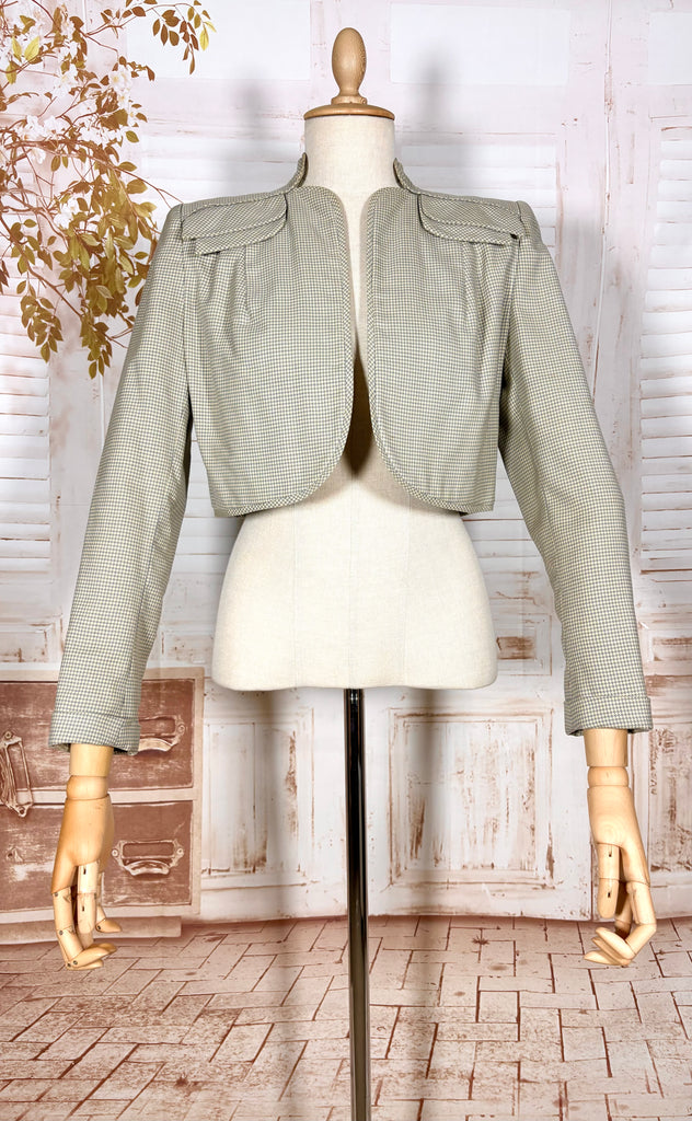 A beautifully tailored 1940s bolero jacket in a soft sage green micro-check, offering that unmistakable wartime silhouette. Cropped and cleanly structured, this piece showcases the sharp tailoring that defined 1940s fashion, with strong shaped shoulders, subtle pleating at the sleeve head, and a softly curved open front. The result is a jacket that feels both polished and effortless.