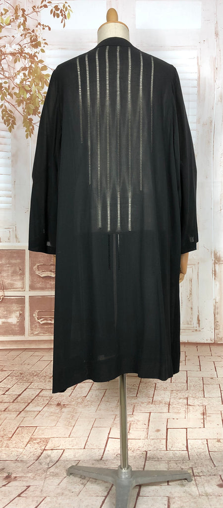 An elegant example of 1930s tailoring, this lightweight black crepe coat captures the understated sophistication of the era. Designed with fine pintuck detailing at the shoulders and finished with delicate openwork accents along the sleeves and back, it embodies the streamlined refinement of pre-war fashion. The unstructured, fluid silhouette makes it a versatile layering piece, perfect for both day and evening wear.