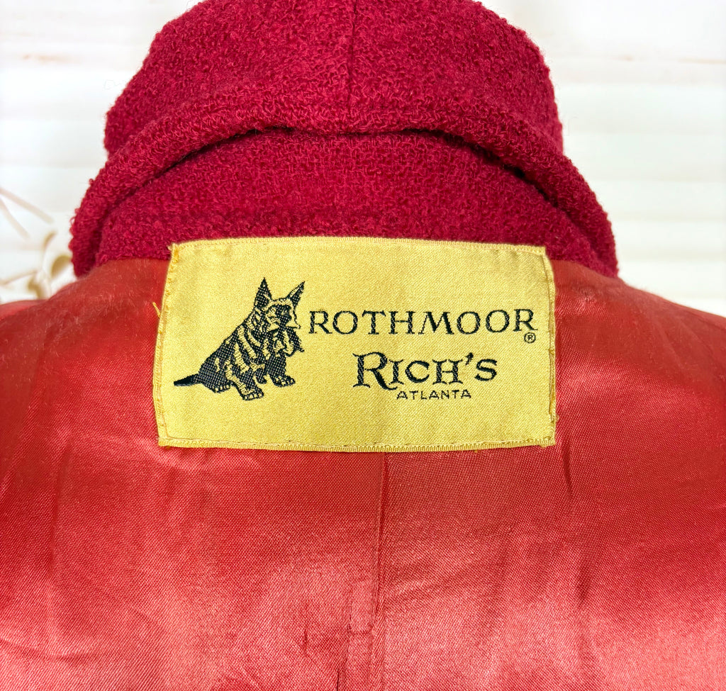 A striking late 1940s–early 1950s lipstick red coat by Rothmoor, a label celebrated for its quality construction and elegant ready-to-wear throughout the mid-century period. Made for Rich’s of Atlanta, this piece perfectly reflects the era’s focus on bold colour, strong silhouettes, and refined craftsmanship.