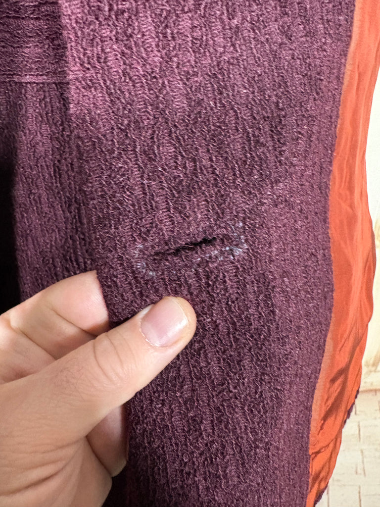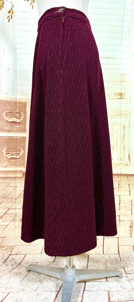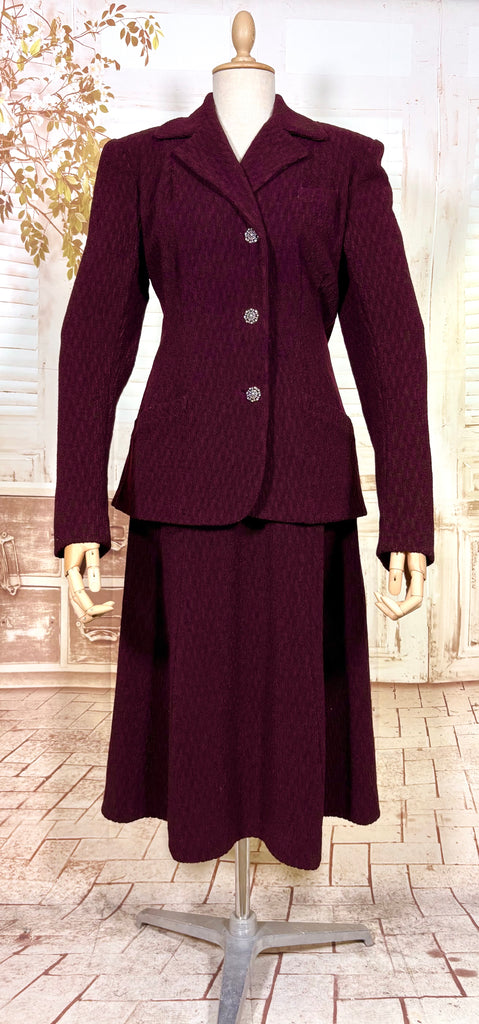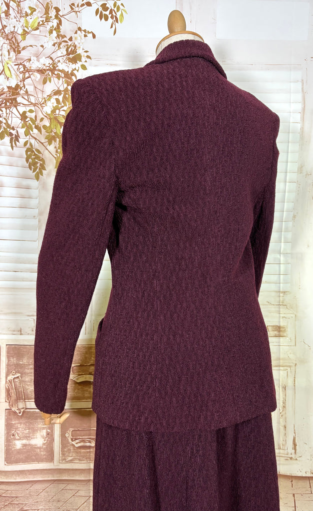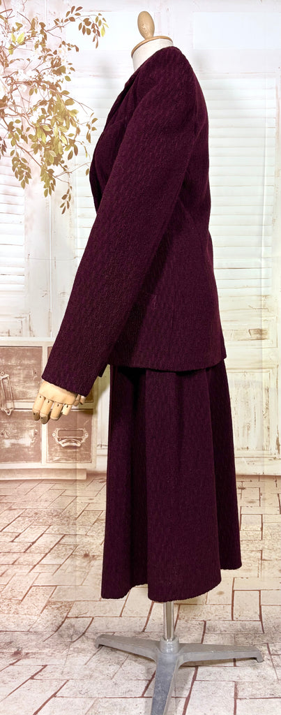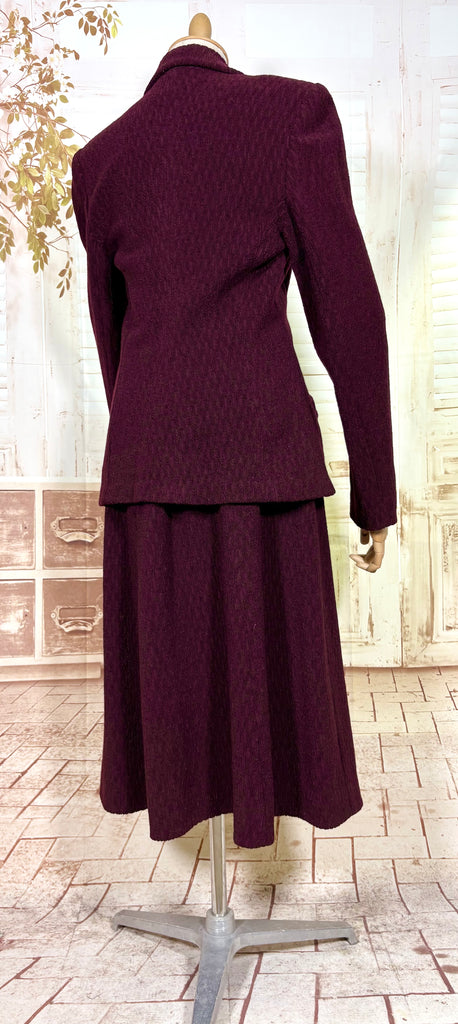 A beautifully tailored original 1940s women’s suit in a rich plum tone, defined by strong shoulders, a nipped waist, and a softly flared skirt. The textured fabric adds depth and quiet interest, giving this set a sense of weight and presence without feeling heavy. Elegant, purposeful, and unmistakably of its era.