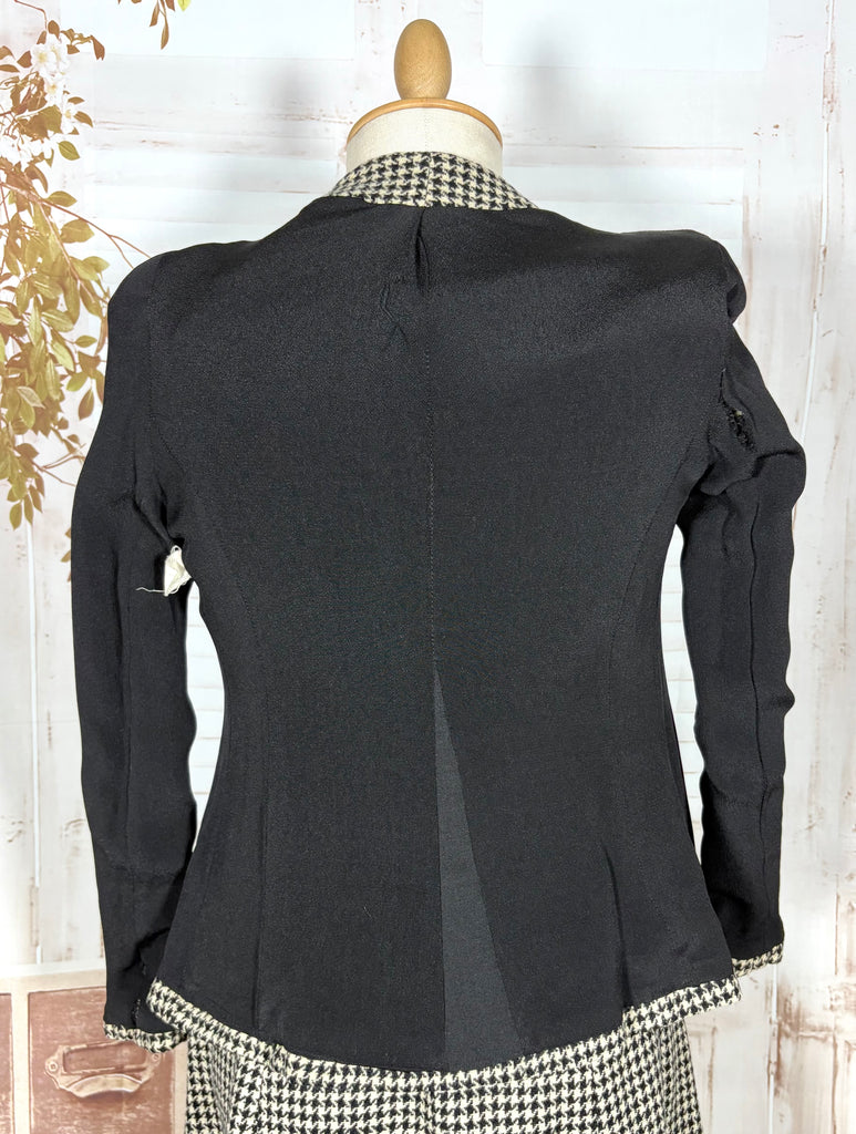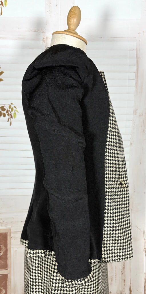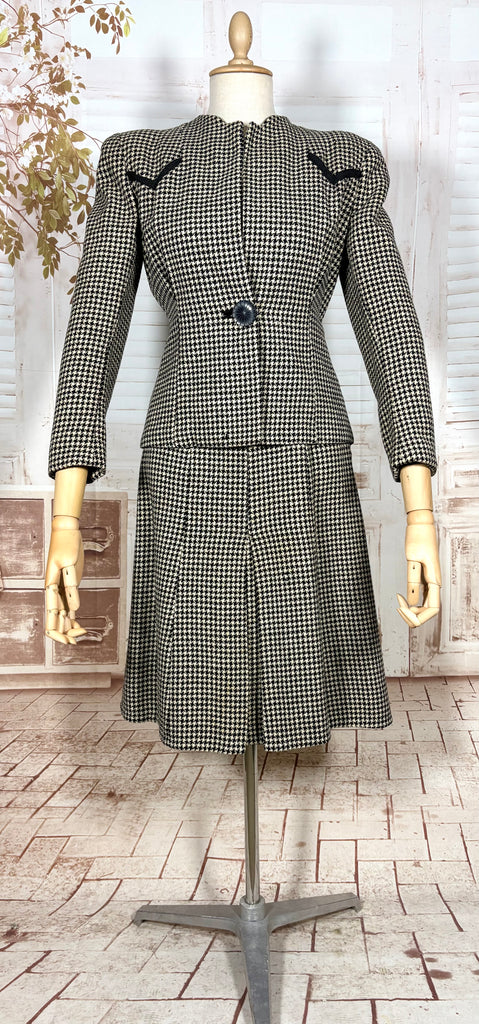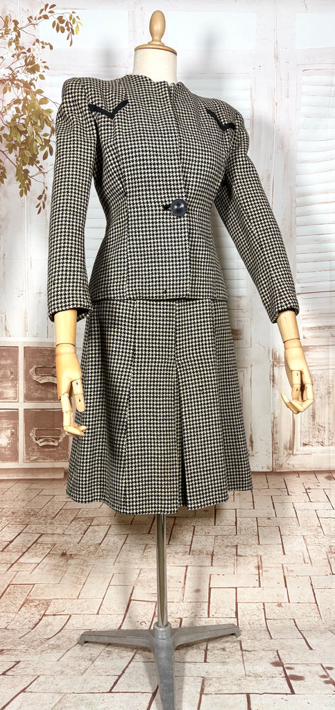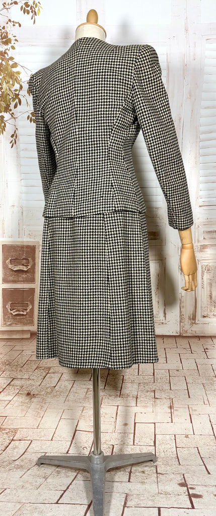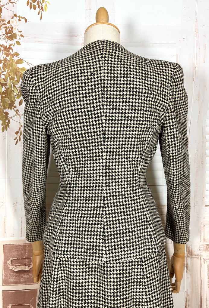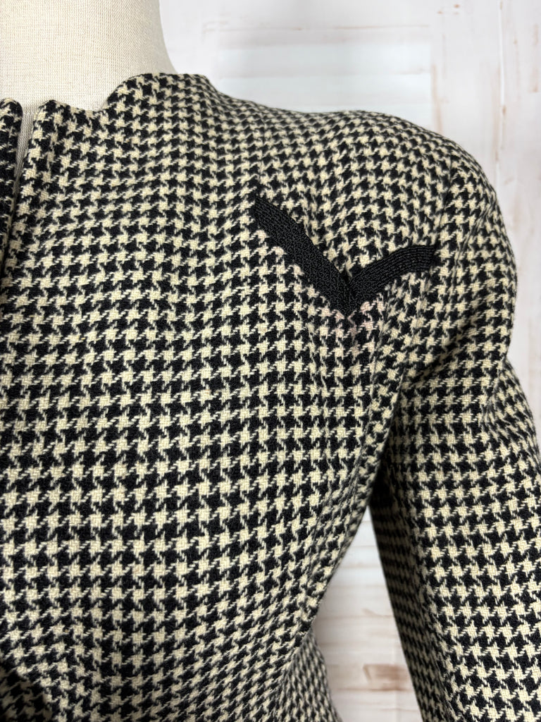 A striking original 1940s houndstooth suit defined by powerful shoulder structure and precise wartime tailoring. Cut in a classic black and ivory wool houndstooth, this two-piece suit captures the bold, authoritative silhouette that defined 1940s women’s fashion, balancing sharp tailoring with wearable elegance.