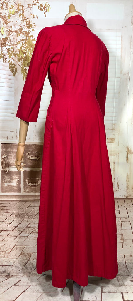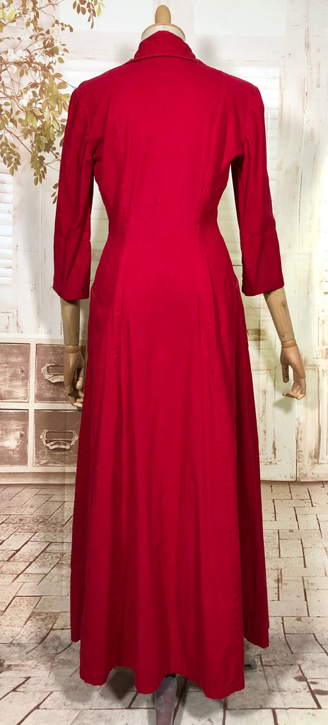 This dress is the epitome of 1940s hostess elegance, practical yet unmistakably stylish. Its dramatic length and vivid hue make it perfect for evening entertaining, vintage events, or collectors of authentic mid-century fashion.