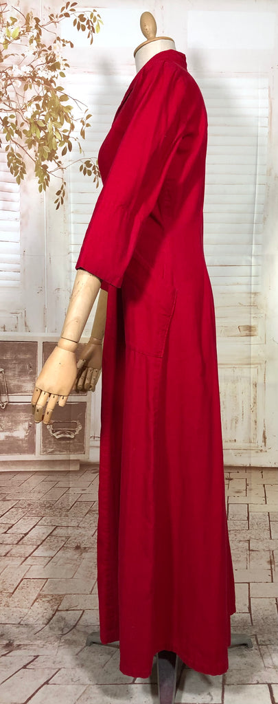 This striking 1940s hostess dress in lipstick red corduroy is a rare and glamorous take on post-war domestic fashion. Designed for entertaining at home, it features a sleek metal zip front, generous hip pockets, and a full-length, gently flared skirt that moves beautifully. The rich red corduroy adds texture and depth, while the structured collar and three-quarter sleeves lend a polished, feminine silhouette.