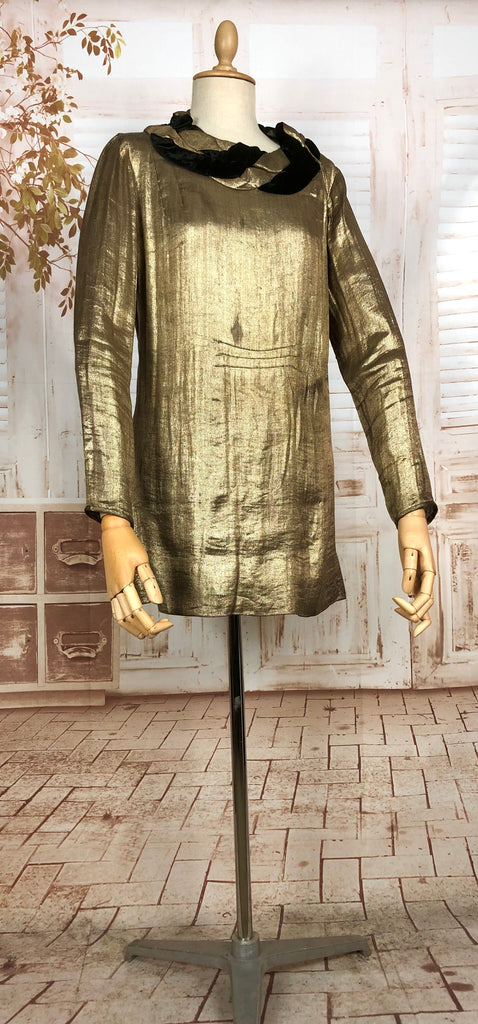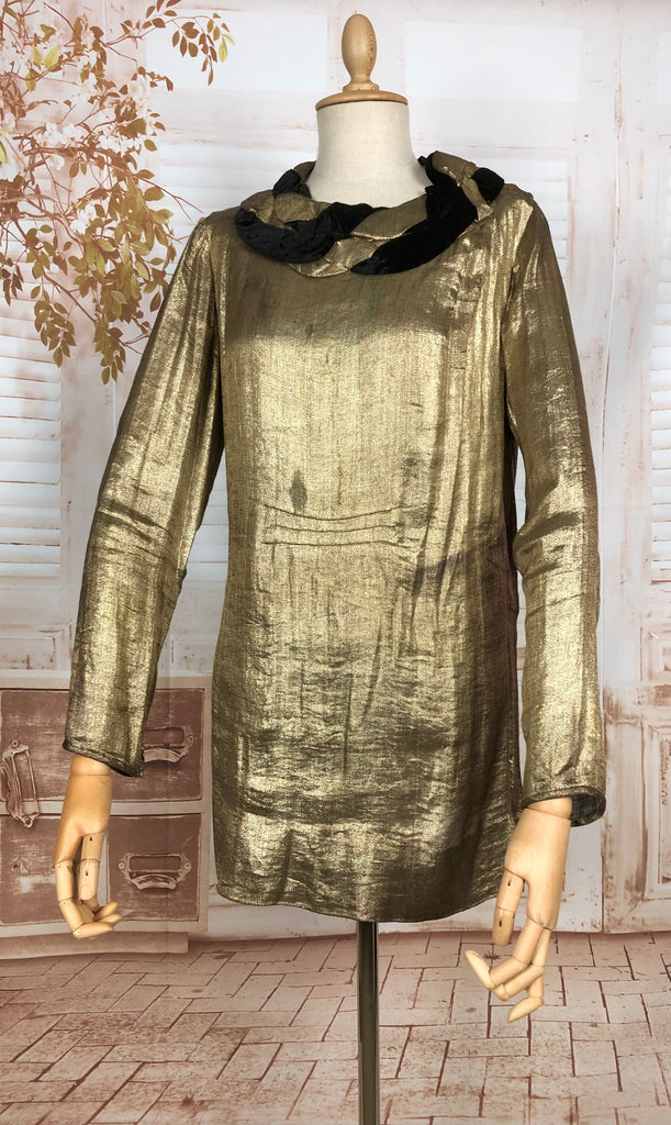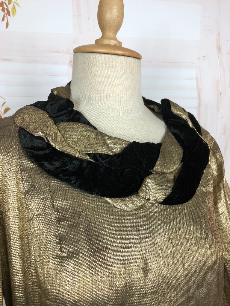Radiating Jazz Age glamour, this striking 1920s gold lamé tunic captures the opulence and innovation of early eveningwear design. The shimmering metallic fabric is complemented by a sculptural braided collar combining black velvet and lamé, giving a sense of understated luxury that was so emblematic of the era.