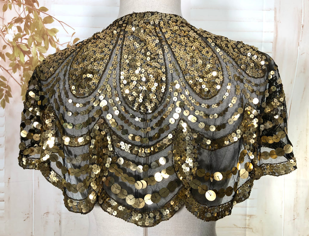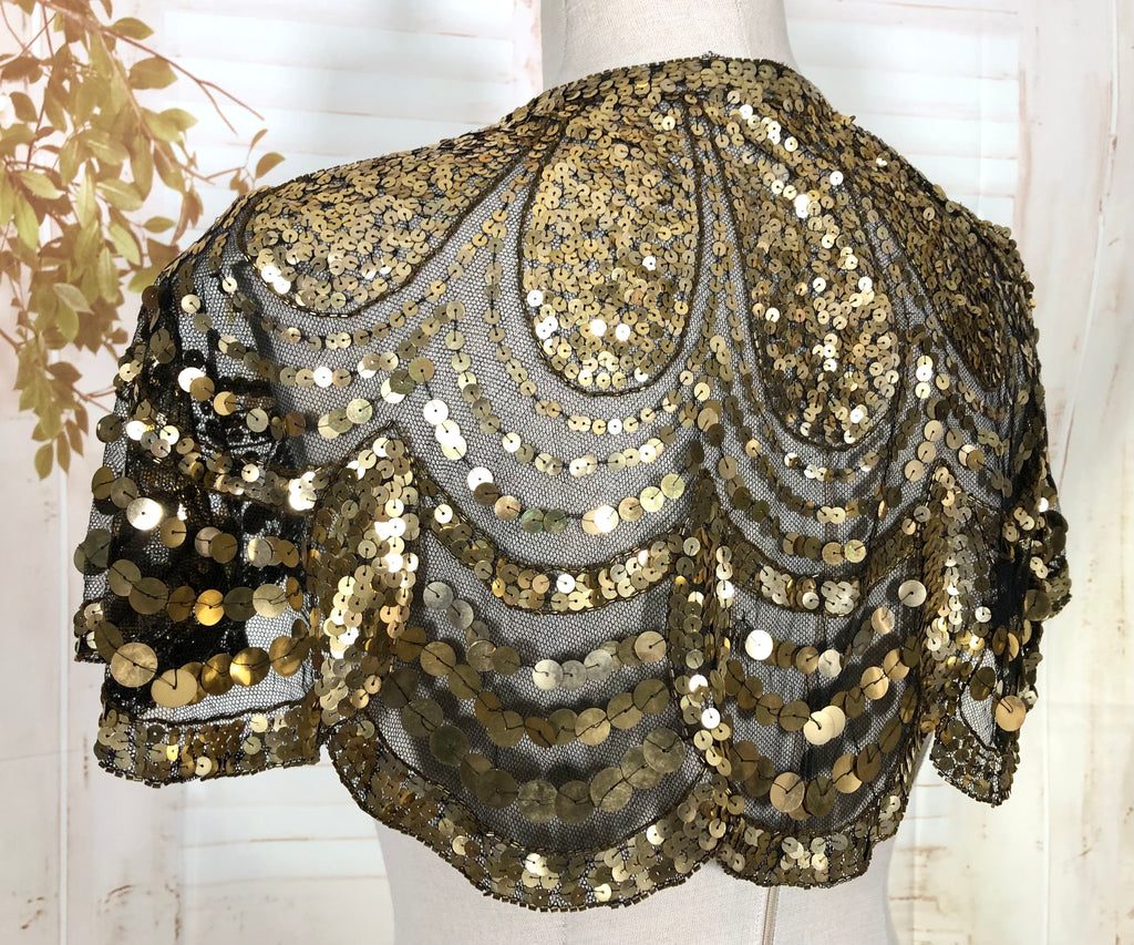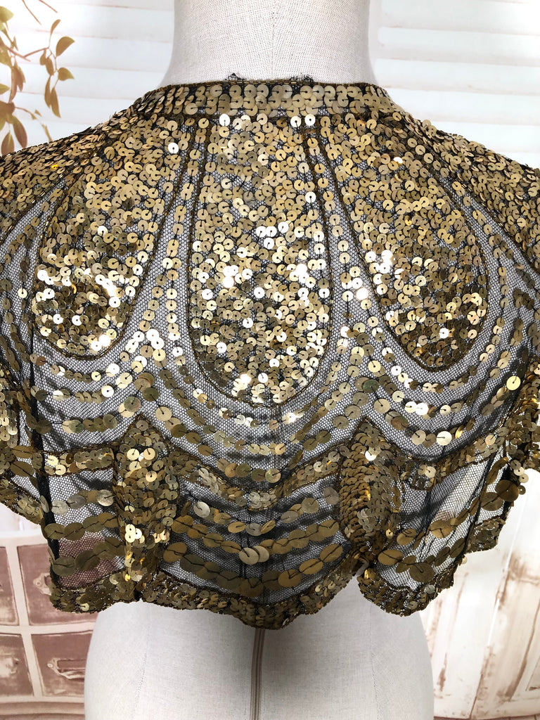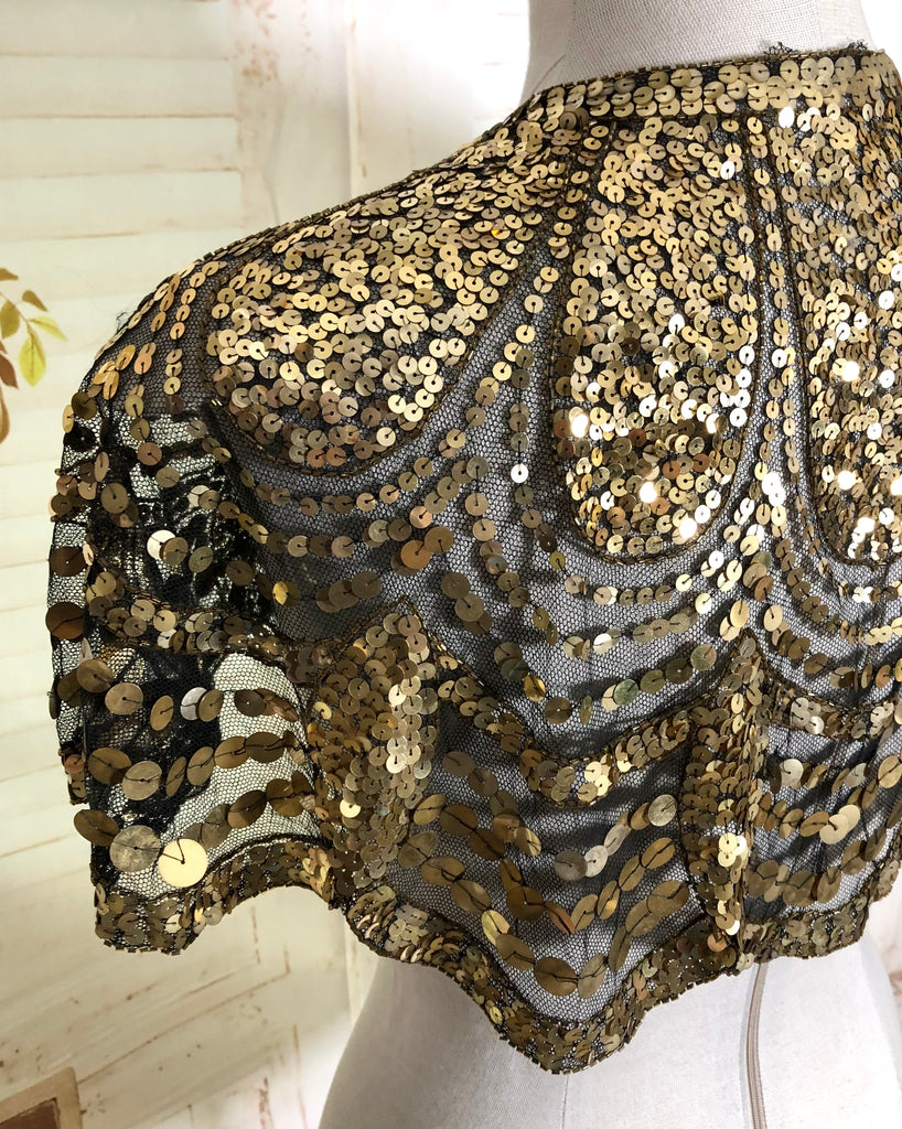 This dazzling 1930s evening capelet is a true Art Deco treasure, designed to bring instant glamour to any look. Made from fine black mesh densely covered in gold sequins arranged in elegant scalloped arcs, it captures the opulence of 1930s eveningwear with beautiful craftsmanship and movement. Originally intended to be worn over a gown or slip dress, it adds a striking vintage shimmer that’s equally captivating for modern styling or performance costume.