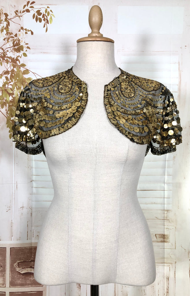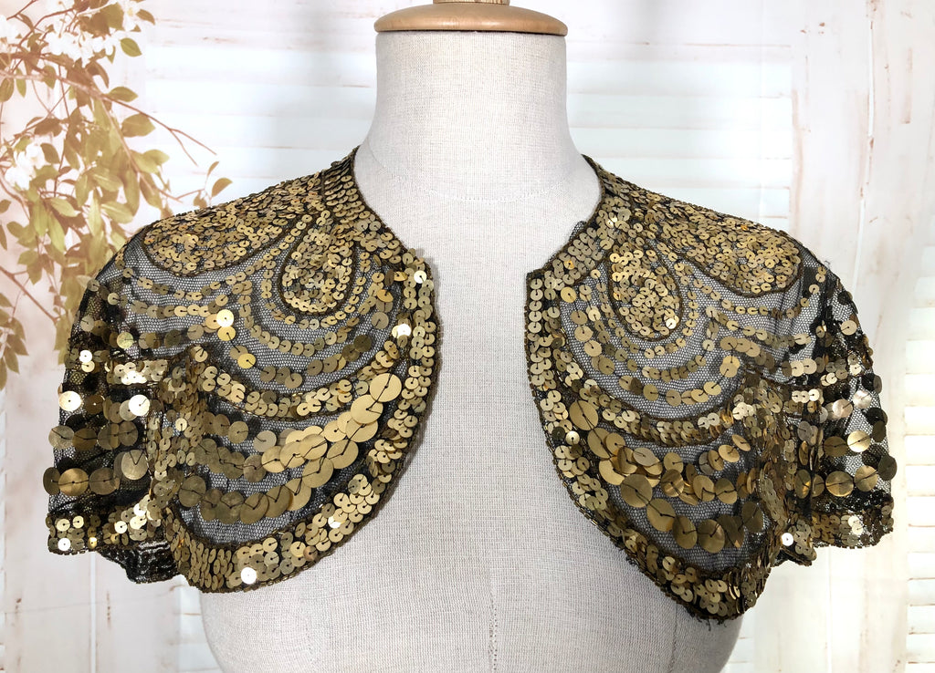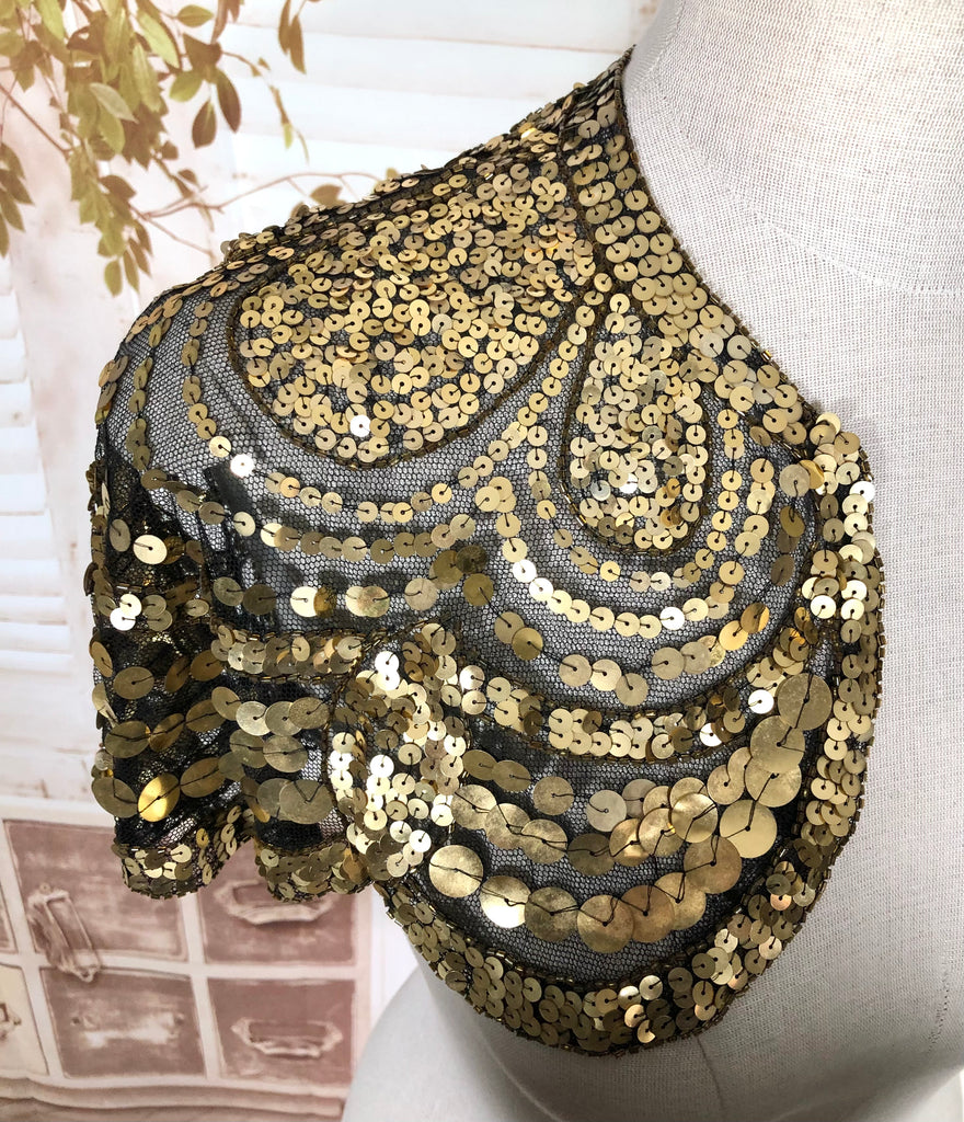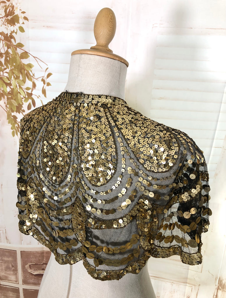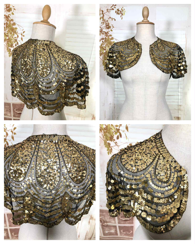 This dazzling 1930s evening capelet is a true Art Deco treasure, designed to bring instant glamour to any look. Made from fine black mesh densely covered in gold sequins arranged in elegant scalloped arcs, it captures the opulence of 1930s eveningwear with beautiful craftsmanship and movement. Originally intended to be worn over a gown or slip dress, it adds a striking vintage shimmer that’s equally captivating for modern styling or performance costume.