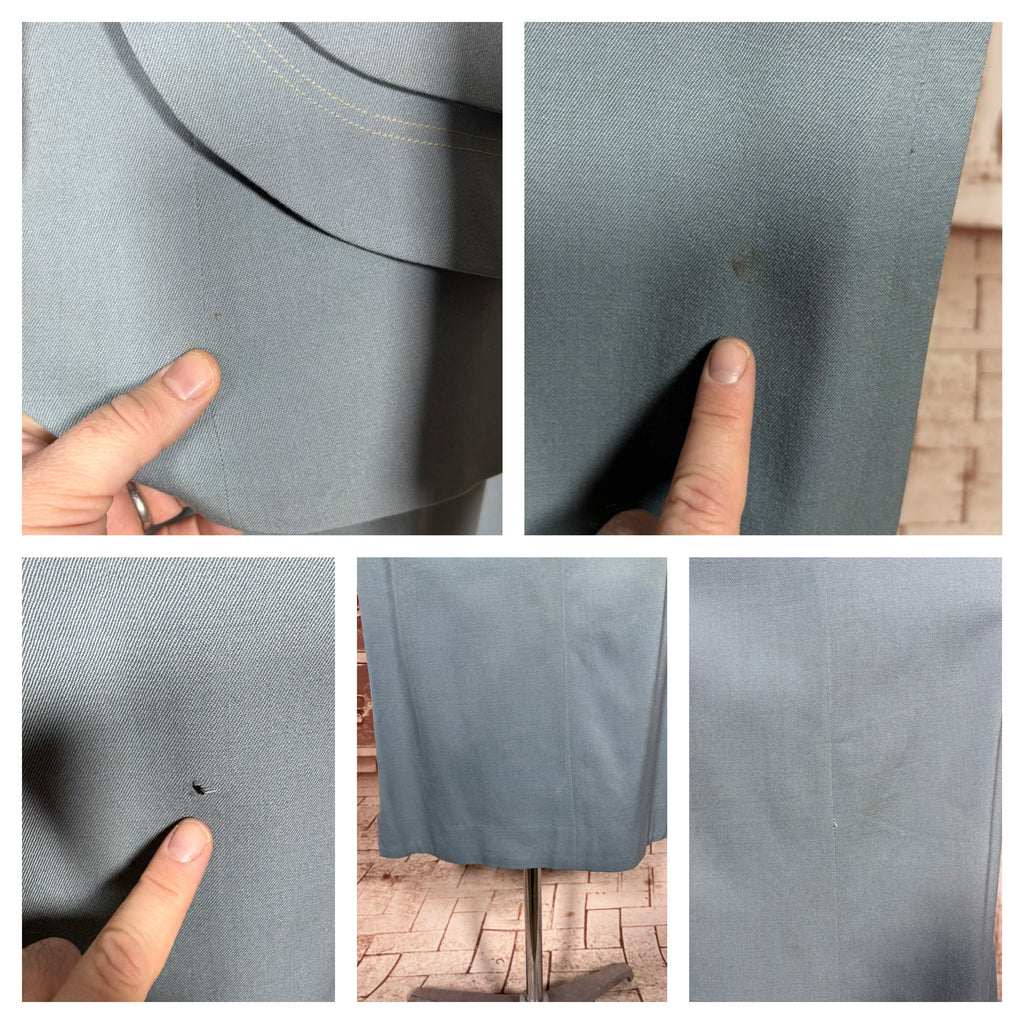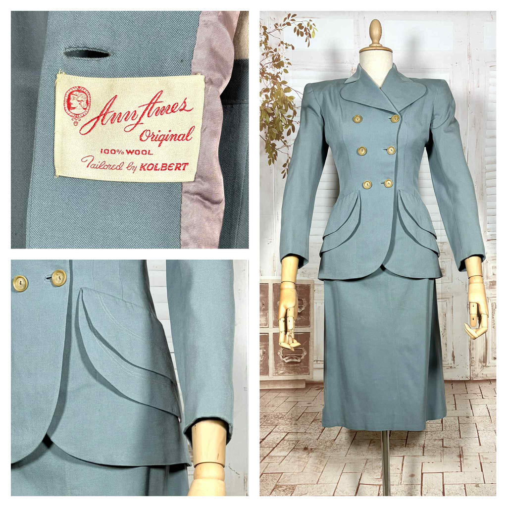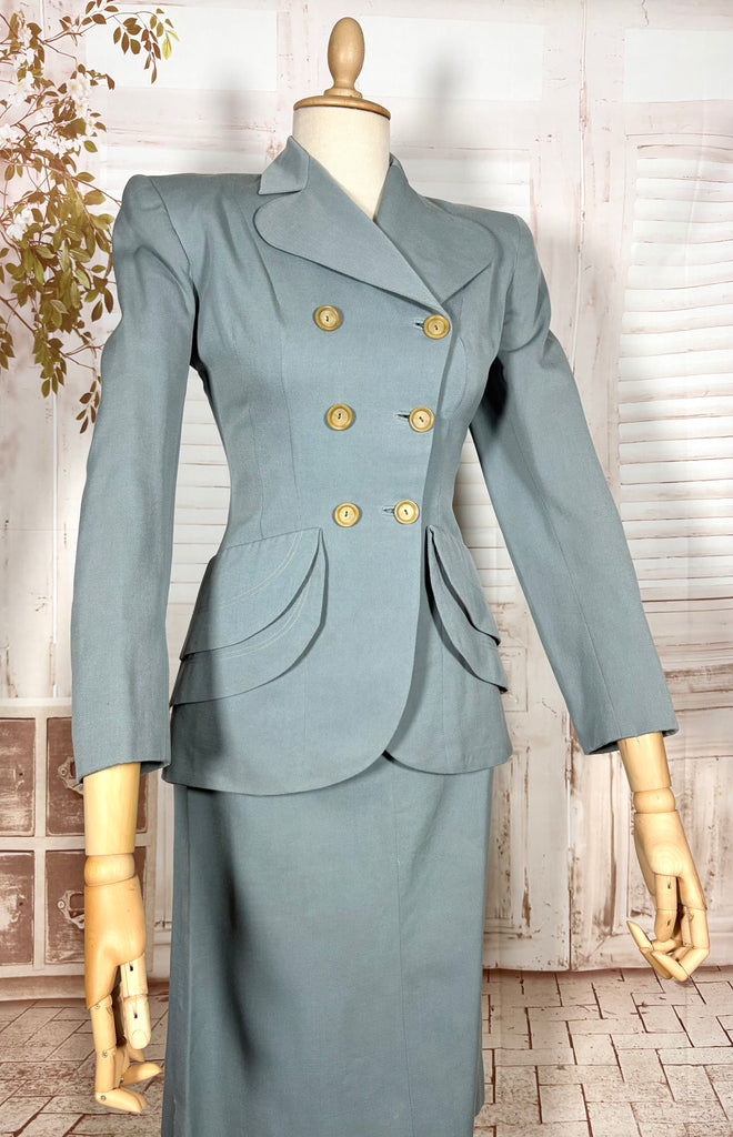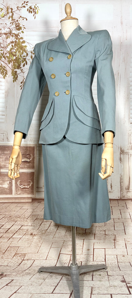 A striking example of 1940s tailoring, this duck-egg blue wool suit showcases sculptural design and precision cut work. The double-breasted jacket features elegant tiered detailing at the hips, creating a softly architectural silhouette that defines the waist and balances the strong shoulder line typical of the era. Tailored in quality wool, this is a refined, highly wearable piece of post-war design.