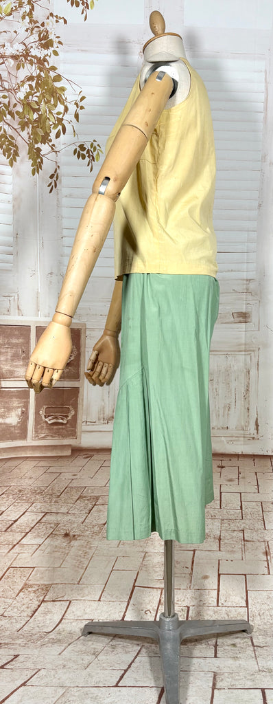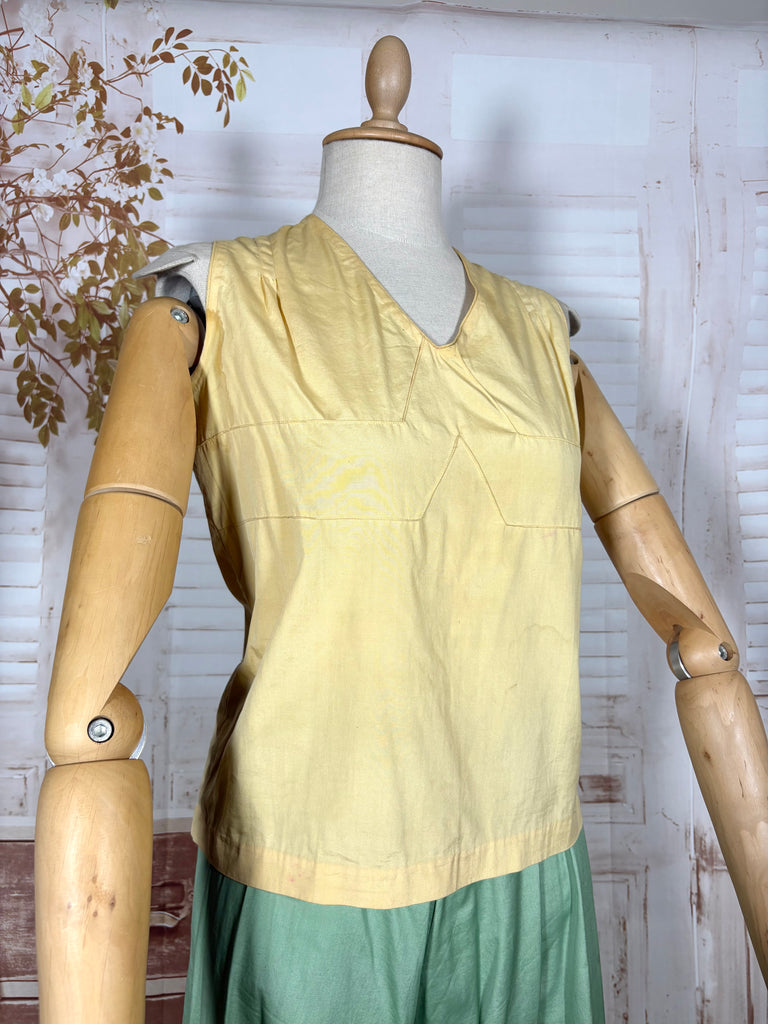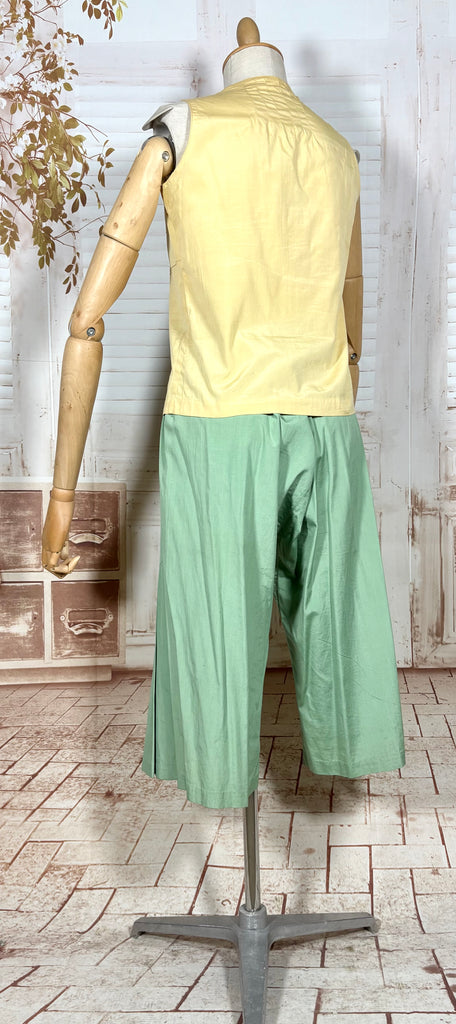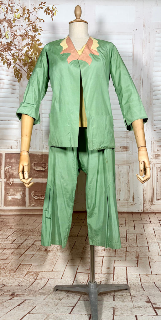 Made from lightweight silk, the set features wide-leg trousers, a simple sleeveless top, and a coordinating jacket finished with distinctive peach and yellow detailing at the neckline. A true statement piece of 1920s resortwear, rarely found complete in all three original components.