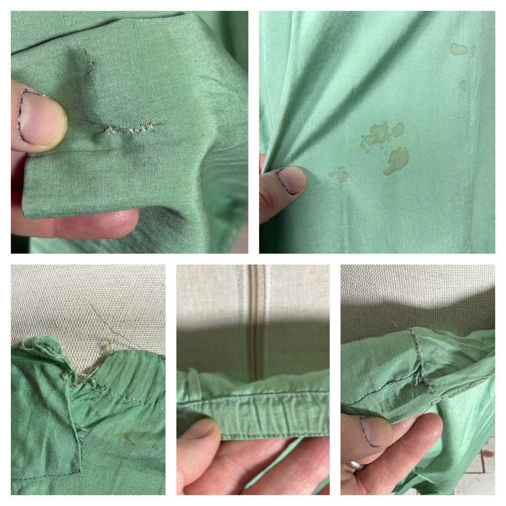 Fair condition with expected signs of wear and a few marks as pictured. There is underarm discolouration and a mark at the front of the top that may improve with further cleaning. There is also a mark on the trouser leg and the elastic at the waist has been removed and needs to be replaced to reinstate the original waist size.