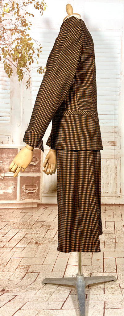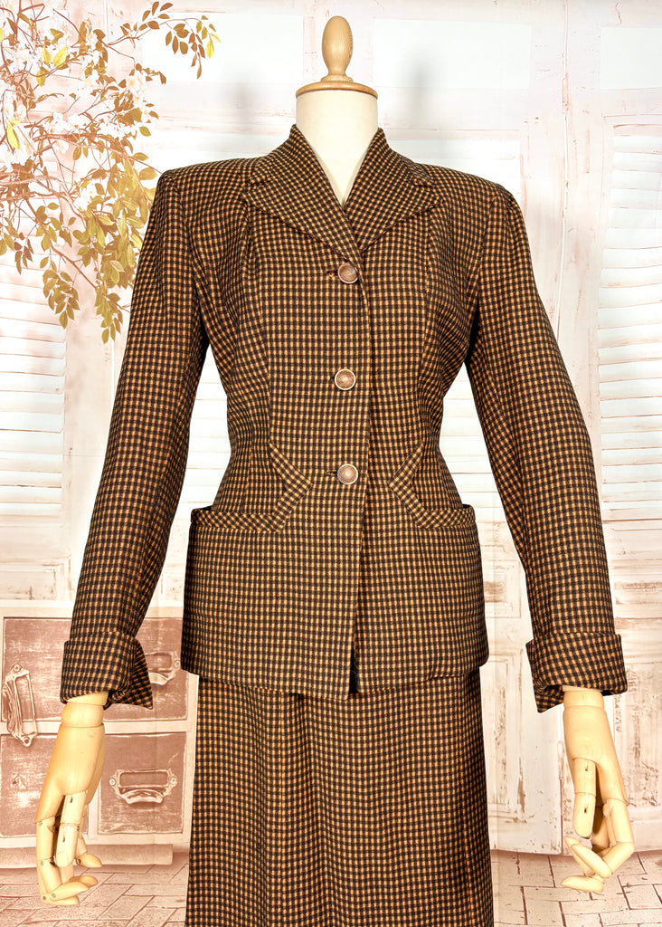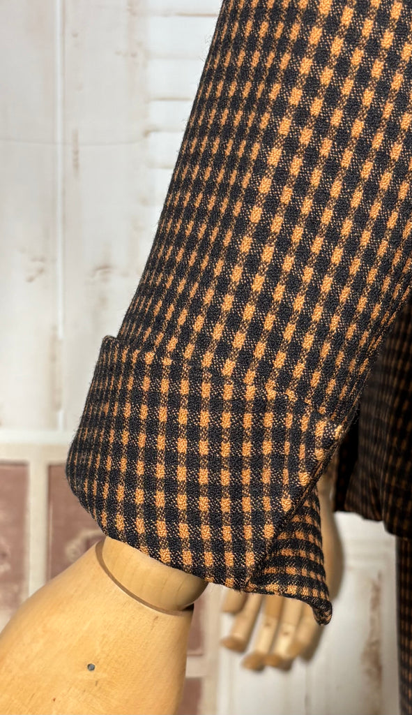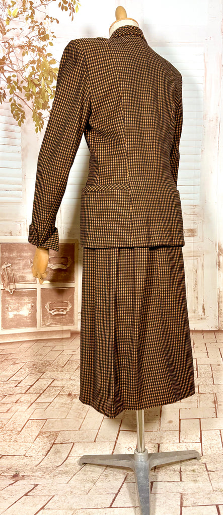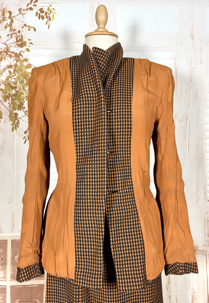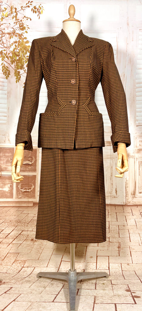 An exceptional original 1940s skirt suit in a rich pumpkin orange and chocolate micro-check. This is classic post-war tailoring at its finest — strong padded shoulders, a sharply defined waist, and beautiful seam work that sculpts the body into that coveted hourglass silhouette. A true investment piece for collectors of authentic 1940s fashion and lovers of precision tailoring.