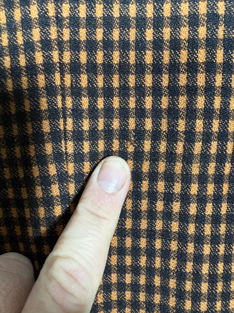 - Fabric: Textured wool check in pumpkin orange and dark brown, lined in crepe