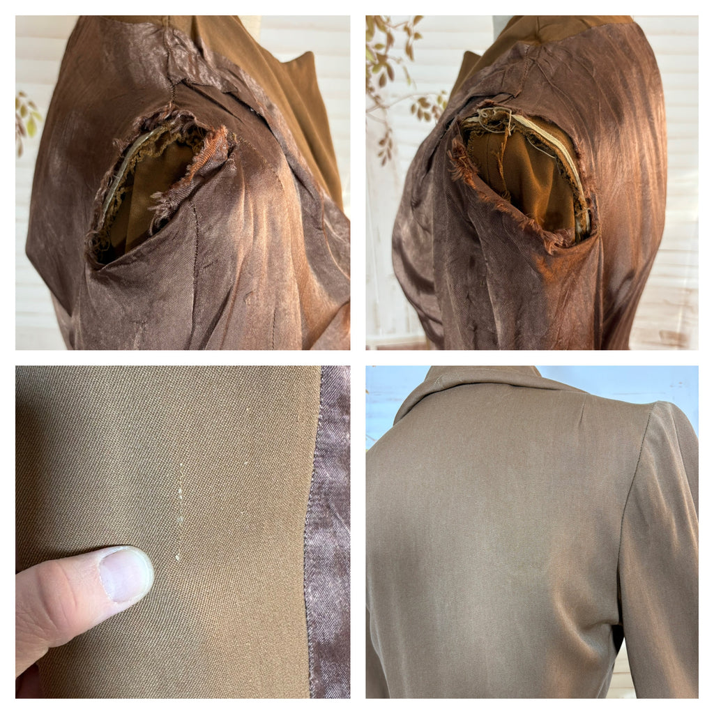 Very good condition with only a couple of minor external flaws and a tear at the shoulder lining as pictured. The coat remains structurally sound with strong original tailoring throughout. The coat is slightly darker in real life, a true milk chocolate shade.