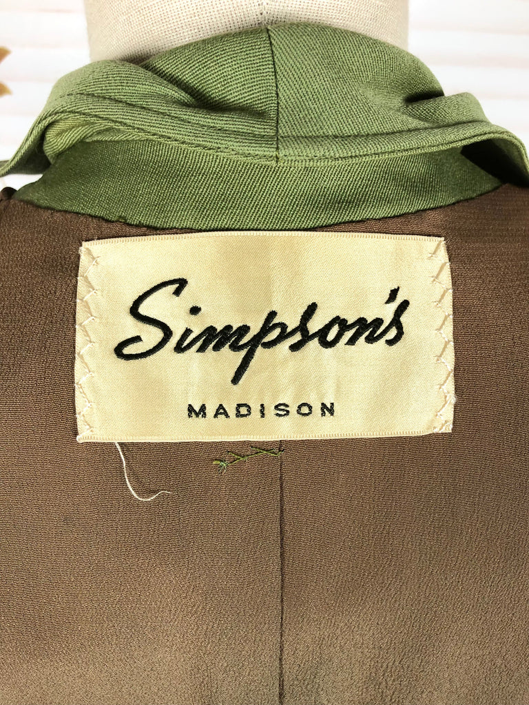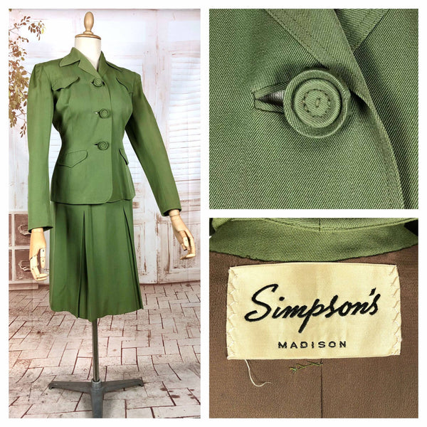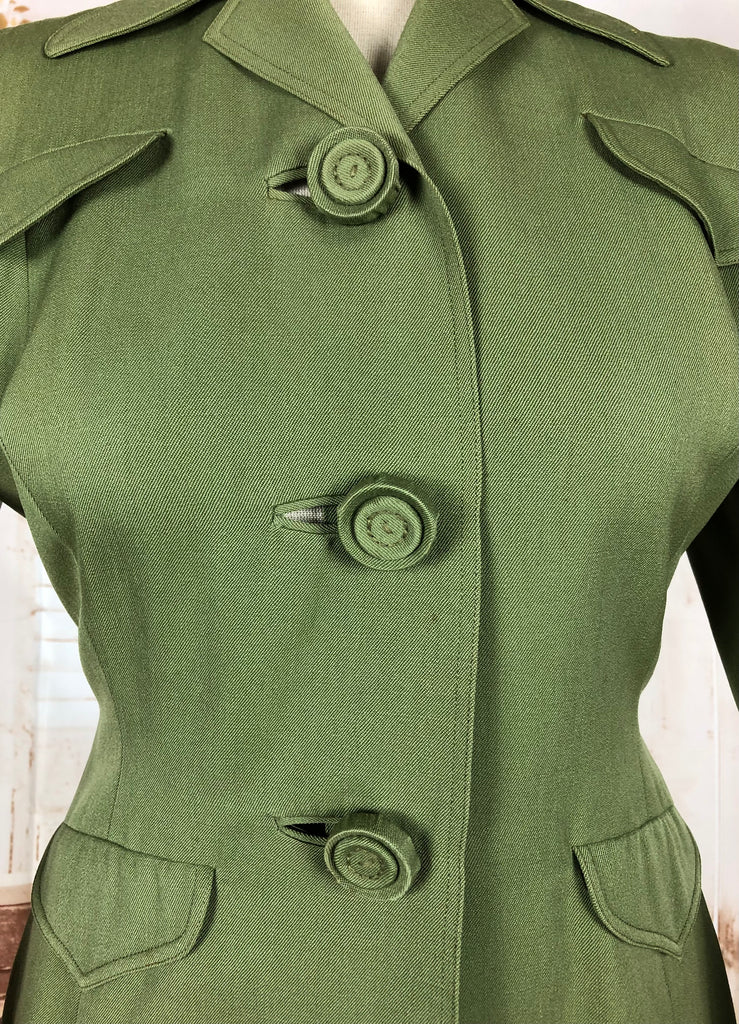 A beautiful example of early 1940s American tailoring, this spring green skirt suit by Simpsons captures the crisp, structured elegance of wartime fashion. The sharply tailored silhouette, exaggerated flap pockets, and bold sculptural buttons reflect the era’s focus on strong shoulders and refined utility—offset here by a playful, fresh green hue.