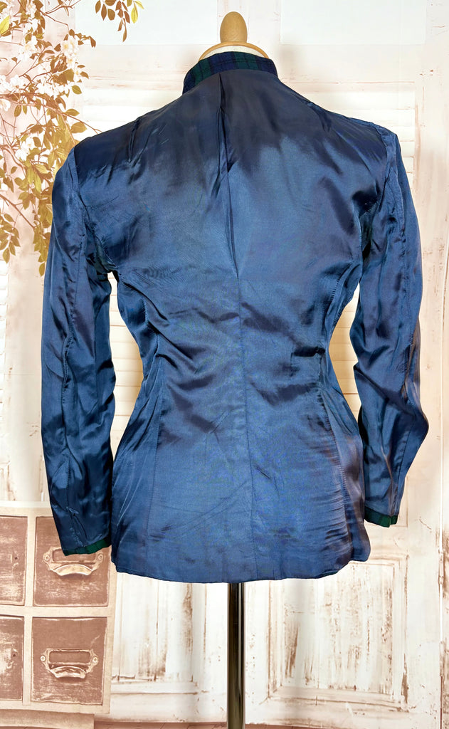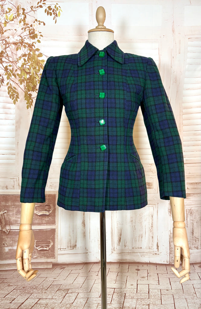 1940s Emerald Green & Blue Plaid Tailored Blazer with Statement Buttons