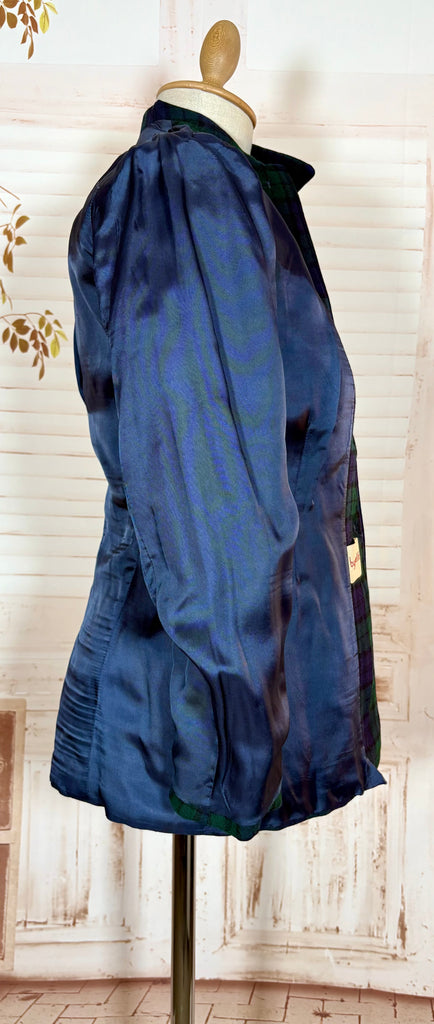 A striking example of authentic 1940s tailoring, this emerald green and deep blue plaid blazer combines sharp wartime structure with refined, design-led details. Cut to emphasise strong shoulders and a nipped waist, it’s finished with unusual emerald green statement buttons that give the piece its distinctive presence. A confident, collectible garment with real visual authority.