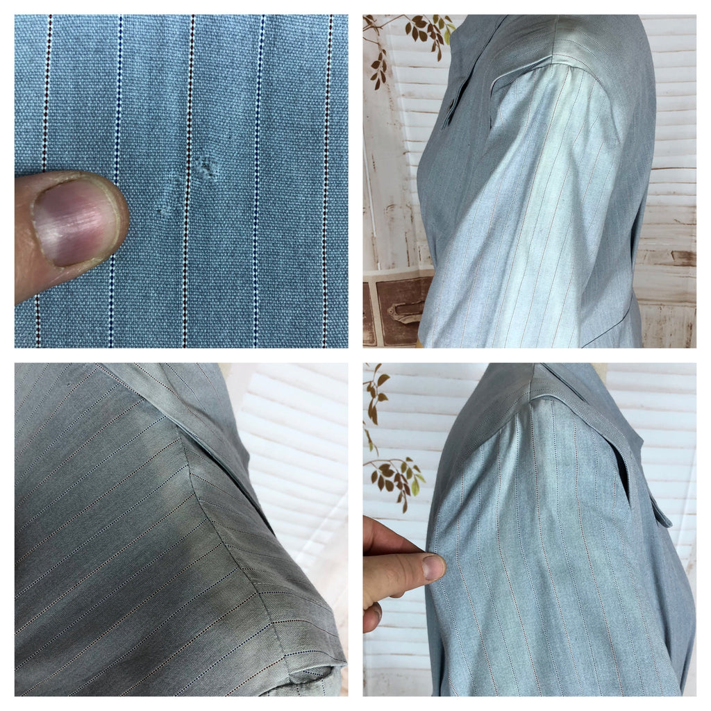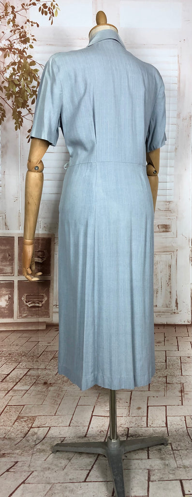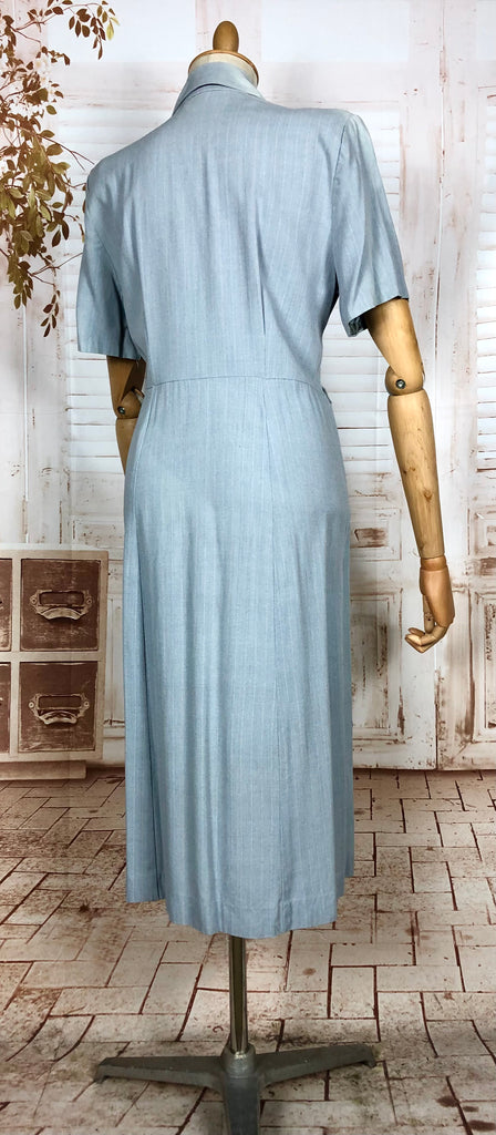 A refined and cleverly constructed 1940s shirtwaister dress in soft dove grey, finely pinstriped in blue and red. This piece combines utilitarian elegance with precise tailoring, resulting in a garment that is as visually sharp as it is wearable.