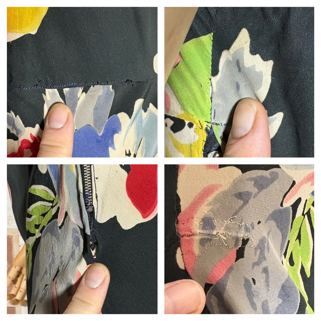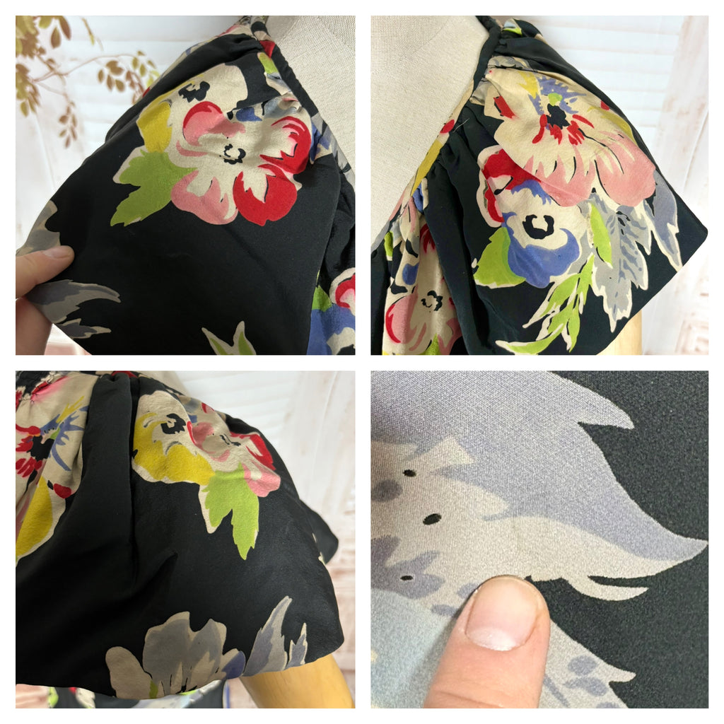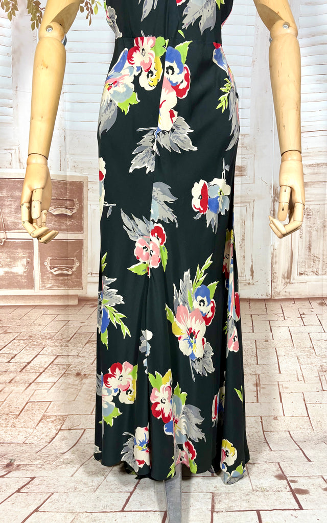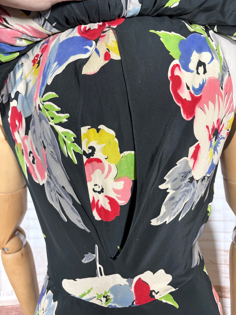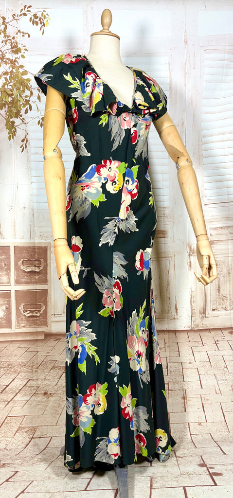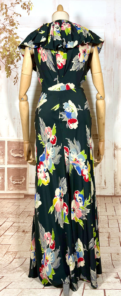 This is a quintessential 1930s dress — fluid, flattering, and quietly dramatic. The combination of luxurious crepe, painterly florals, and a perfectly judged ruffled collar makes it ideal for collectors drawn to elegant vintage eveningwear with real presence. Equally stunning worn as a statement piece or styled with minimal accessories to let the cut and fabric speak for themselves.