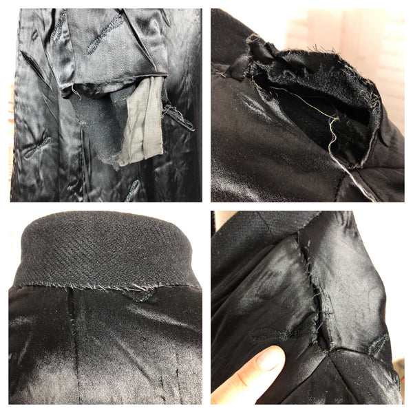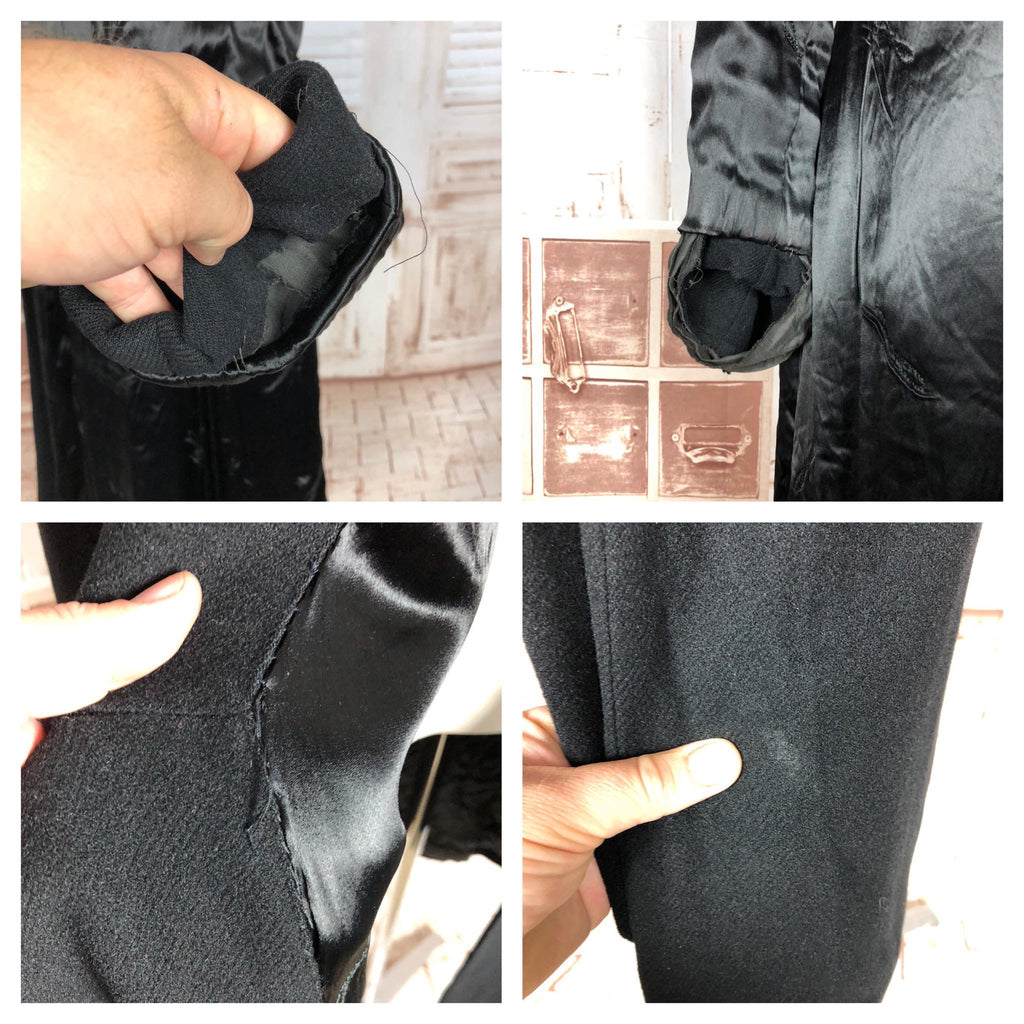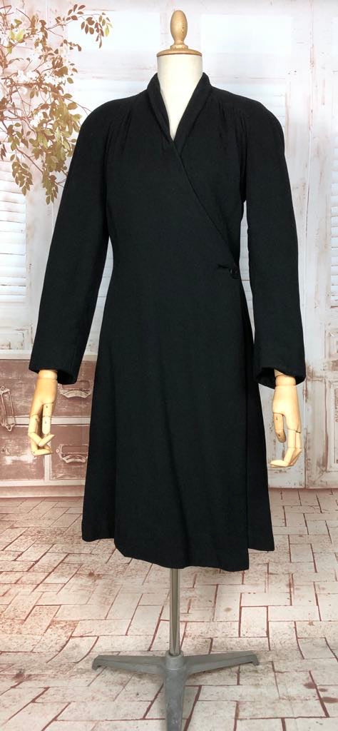 This fabulous coat was made in the 1930s from black wool. It was cut in an unusual asymmetric wrap over style with a button fastening at the side of the waist. It is lined inside in sumptuous black satin.