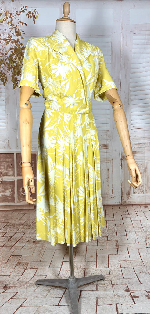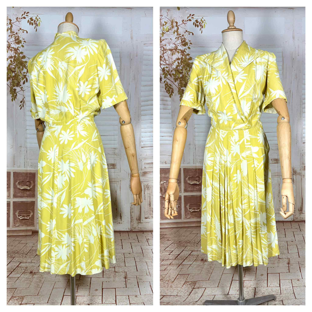 A striking early 1940s day dress in vivid chartreuse rayon, featuring a bold floral print and a sharply tailored silhouette. This piece captures the confident, practical elegance of wartime fashion, with strong lines through the bodice balanced by a fluid, movement-rich skirt. A standout example of authentic early 1940s design with real presence on the body.