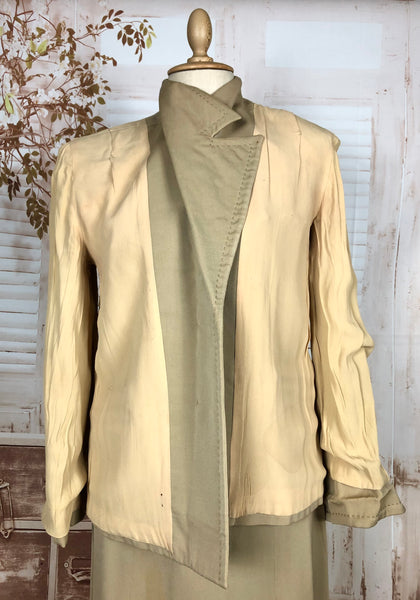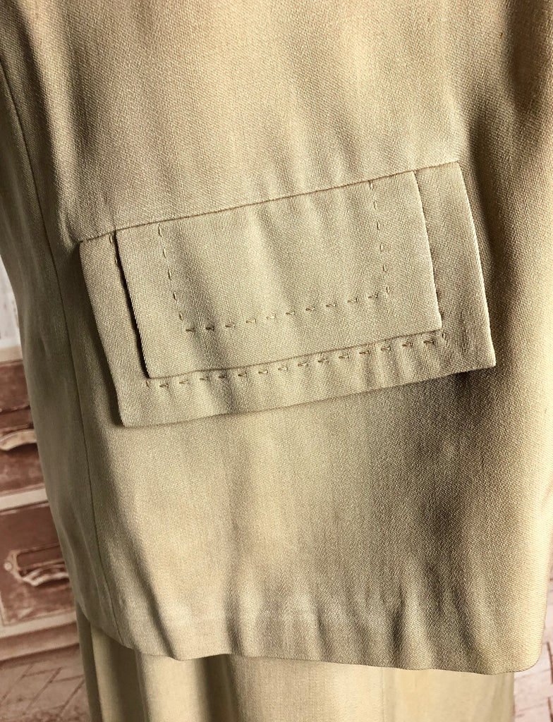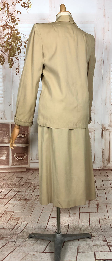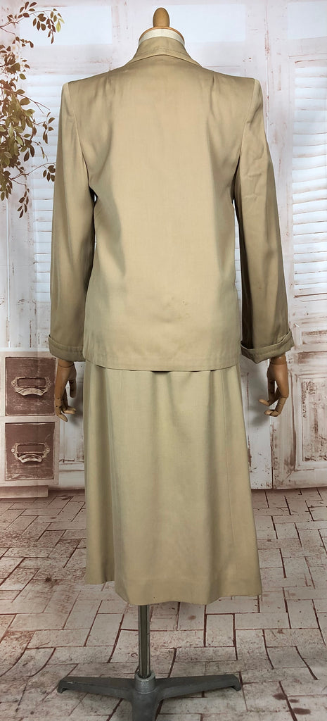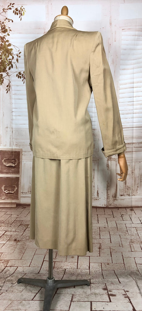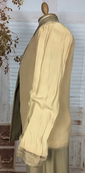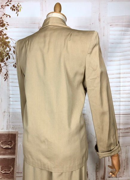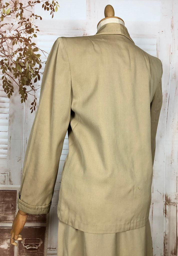 This suit speaks to an era of considered design and enduring quality. The warm neutral tone makes it easy to style with contemporary or vintage accessories, while the silhouette flatters without overpowering. Whether worn together or as separates, it’s a piece of wearable history that carries the quiet confidence of early 20th-century fashion.