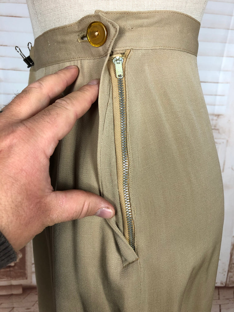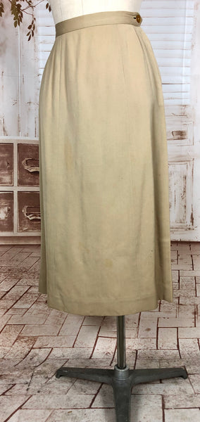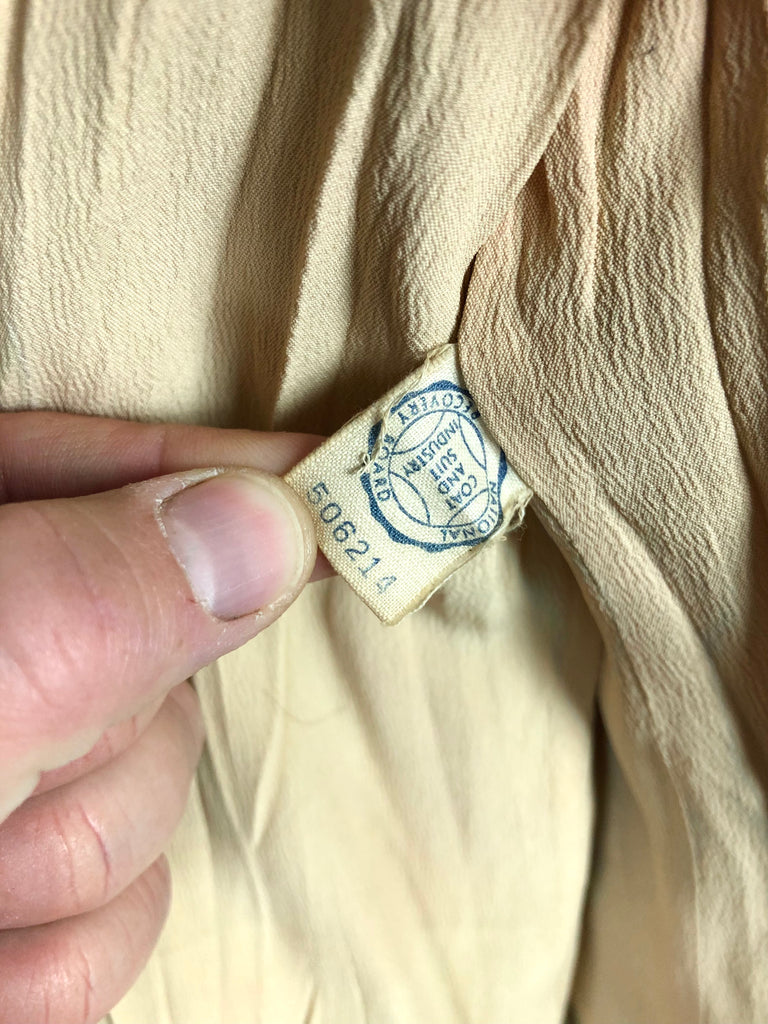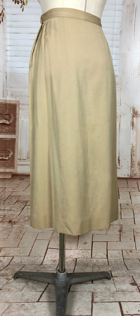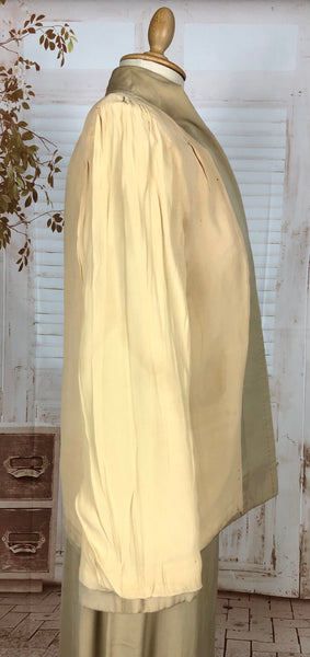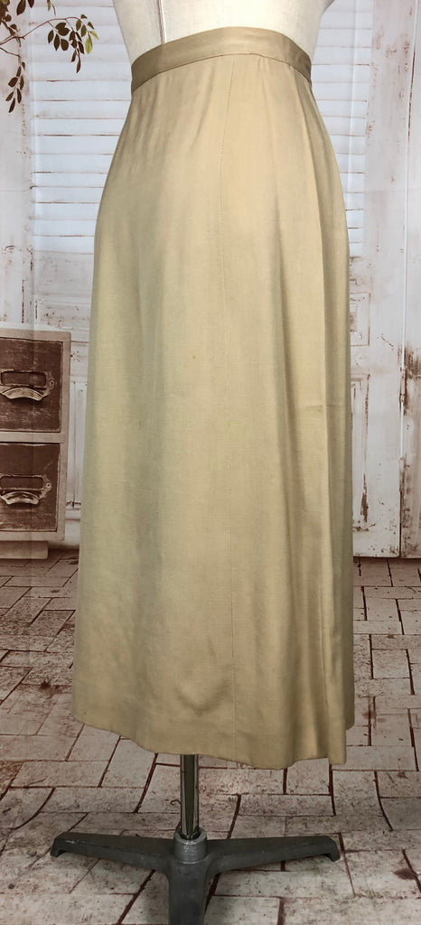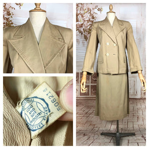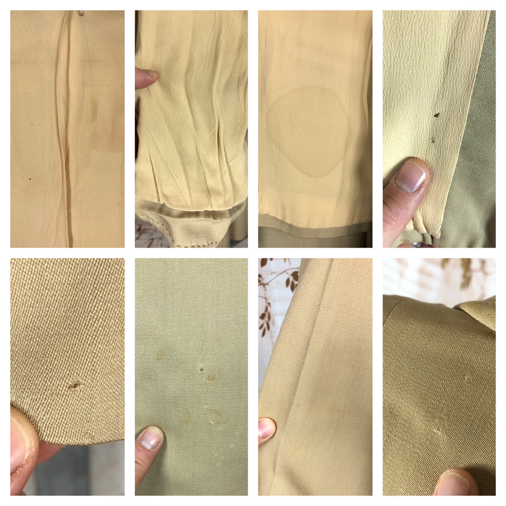 This suit speaks to an era of considered design and enduring quality. The warm neutral tone makes it easy to style with contemporary or vintage accessories, while the silhouette flatters without overpowering. Whether worn together or as separates, it’s a piece of wearable history that carries the quiet confidence of early 20th-century fashion.